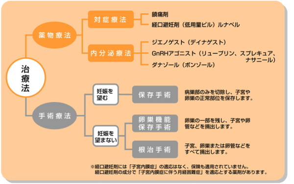 まずは治療方法として一般的なのが薬物療法です。子宮内膜症とは放って置くと悪化してしまう可能性がおおいにあります。子宮内膜症を進行させない方法として有効なのは妊娠をして子宮を休ませると言うことが必要なのですが、この擬似妊娠状況を薬物で作り上げて子宮を休ませてその間に炎症を鎮めるようにしたり、卵巣などに溜まってしまった血液が体内に吸収されるまで待つようにしたりするなどと言った治療をするという方法があります。